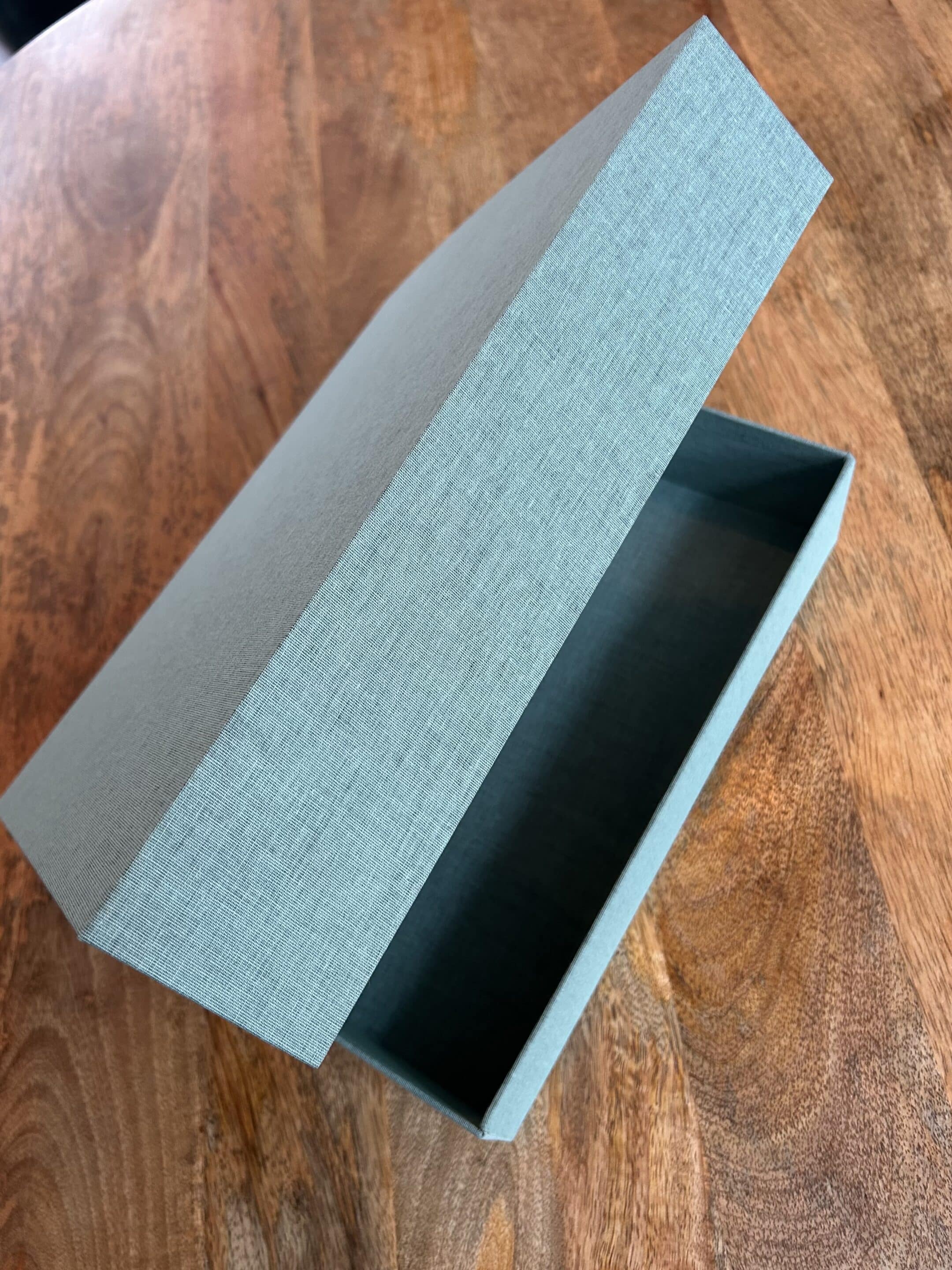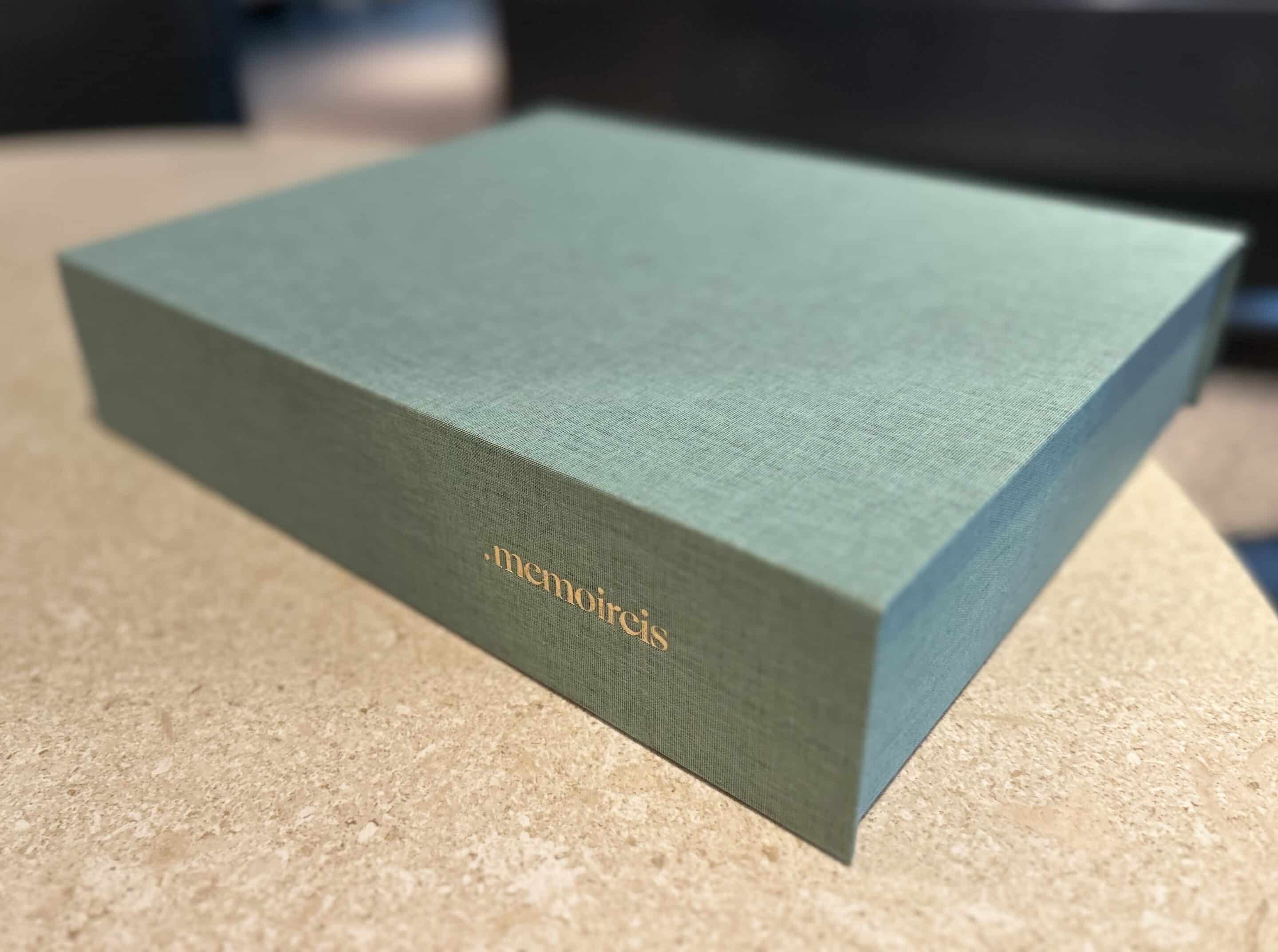 Een luxe, in linnen beklede box om kleine fysieke herinneringen in te bewaren en door te geven.
